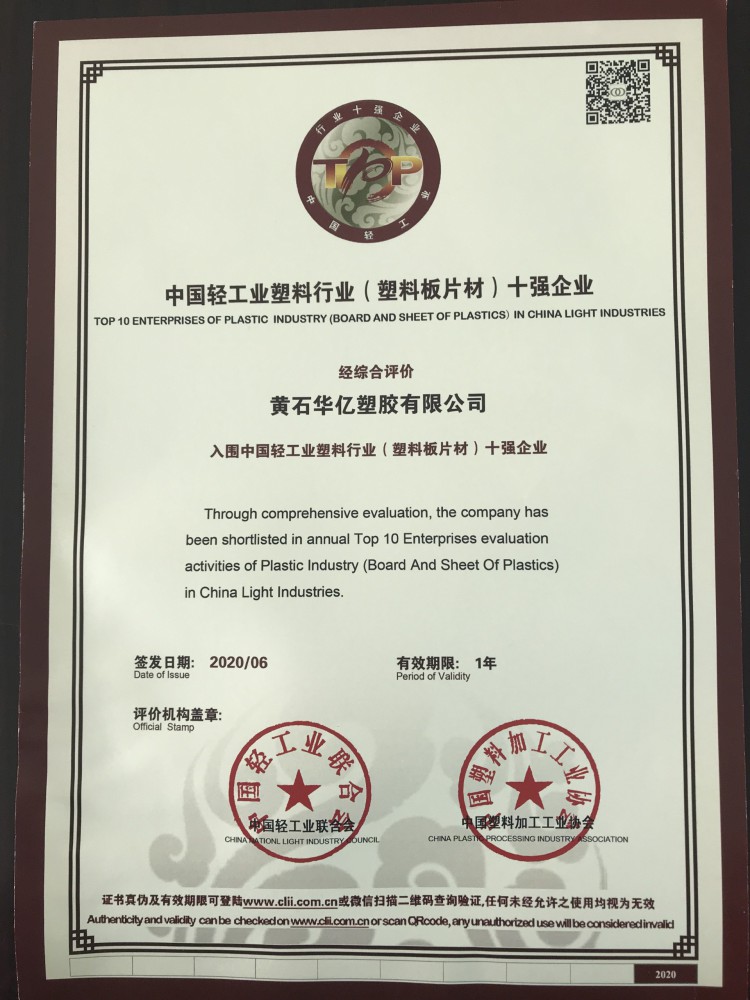 黃石華億塑膠有限公司是一家有50多年生產歷史的PVC層壓板生產型企業,是硬質聚氯乙烯層壓板材國家標準GB/T22789.1-2008主要起草單位之一,公司目前是國內生產PVC層壓板的龍頭企業,集研發、生產和加工為一體的高新技術企業。2016年“華熠”牌商標被國家工商總局認定為中國馳名商標。<···